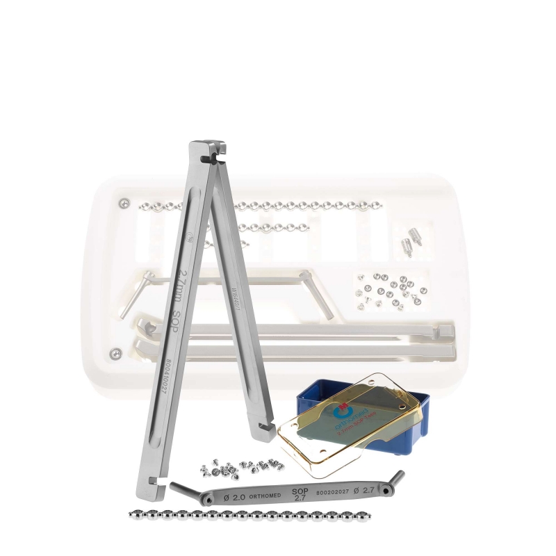 The starter kit contains - SOP™ 2.7mm Bending Iron Left & Right, SOP™ 2.7mm Drill Guide 2.0/2.7mm, SOP™ Case for 2.7mm Bending Tees, SOP™ 2.7mm Bending Tees (pack of 20), SOP™ 2.7mm Interlocking Plate 16 hole