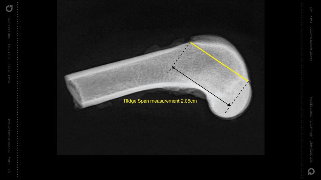 Available in five lengths, starting at a low profile 1.5cm up-to a 3.5cm, the RidgeStop™ implants cover most sizes of dogs (and some cats) for either a medial or lateral luxating patella. Determining the size of the implant required is from the Ridgespan measurement, taken from a standard lateral radiograph, measuring from the proximal extent of the trochlear ridge to the condylar notch.