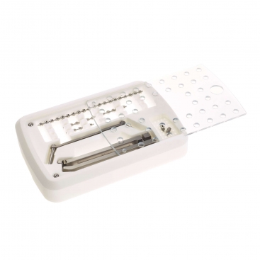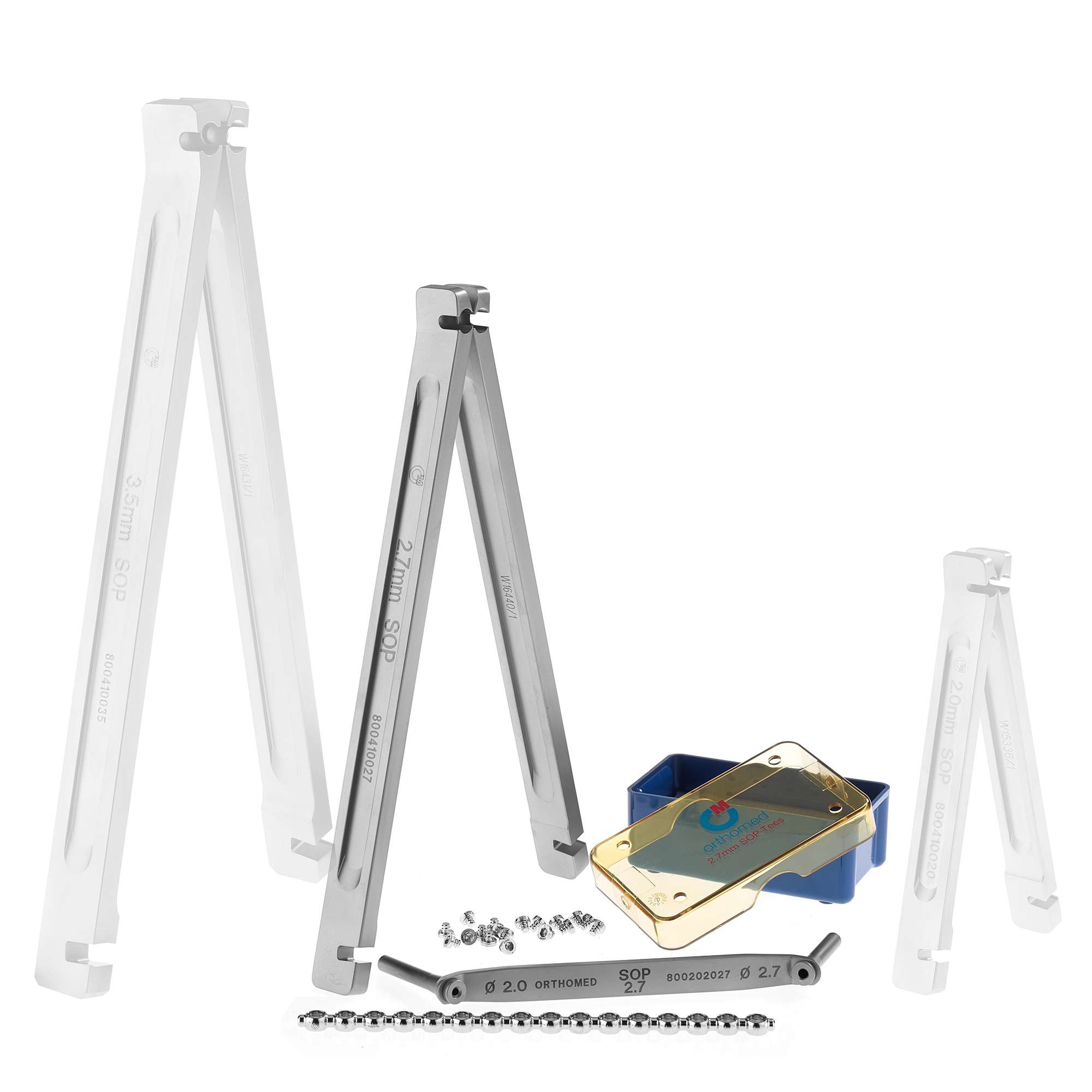 The starter kit contains - SOP™ 2.7mm Bending Iron Left & Right, SOP™ 2.7mm Drill Guide 2.0/2.7mm, SOP™ Case for 2.7mm Bending Tees, SOP™ 2.7mm Bending Tees (pack of 20), SOP™ 2.7mm Interlocking Plate 16 hole